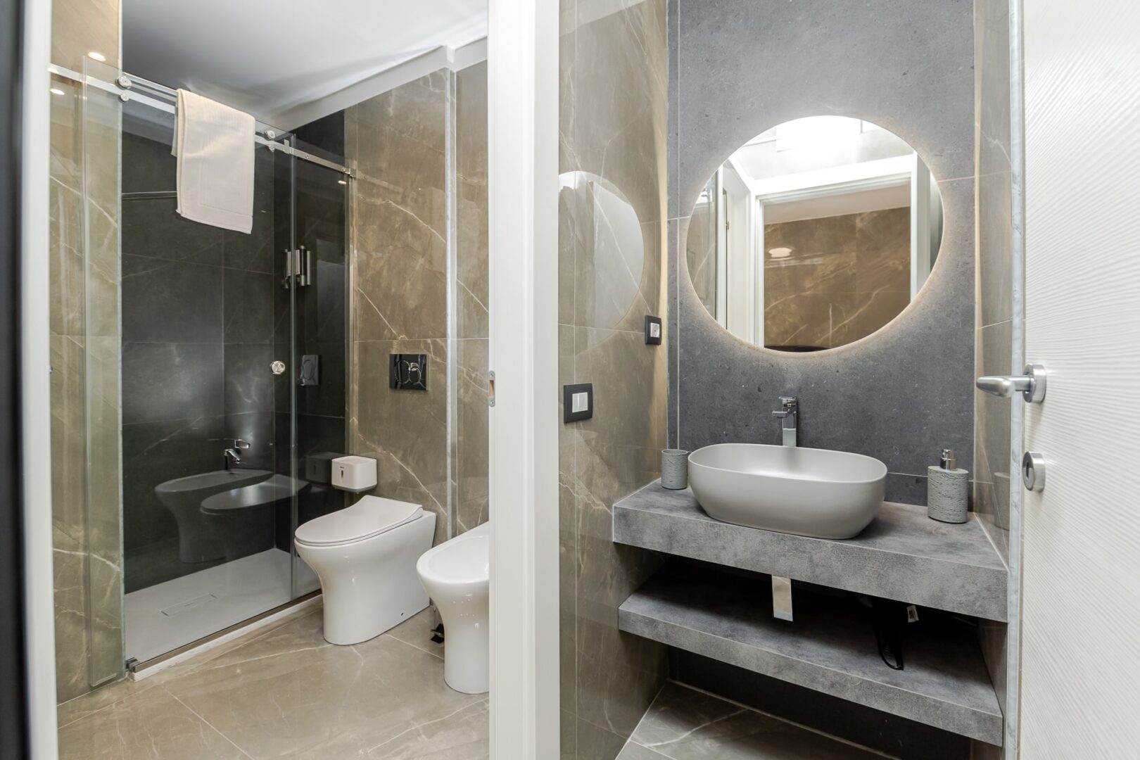 Step into your private en-suite bathroom, where plush towels and eco-friendly dispenser systems for shampoo, conditioner, and body wash complement sleek fixtures and a walk-in rain shower—offering both convenience and a nod to sustainable practices. A personalized climate control unit lets you tailor the temperature to your exact preference, so whether you’re unwinding after a day exploring Mount Etna or preparing for an evening in the vibrant city center, your room is always exactly as you like it.